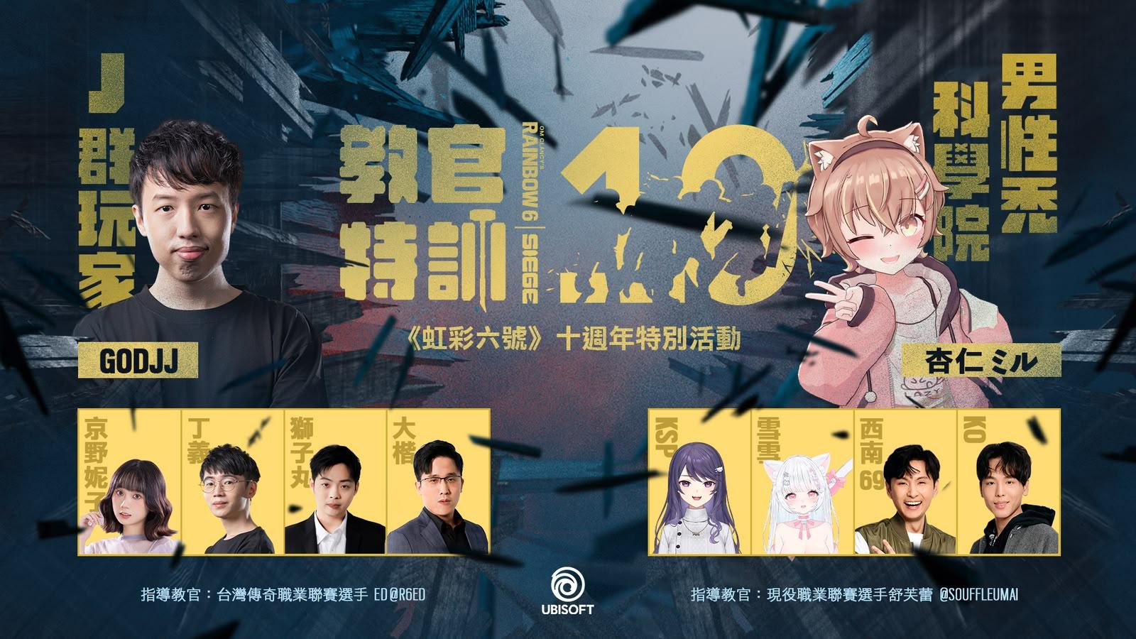 本次特別節目中將帶來台灣電競戰隊 Daystar、SharkLFO 表演賽,並邀請到曾參與遊戲精彩 10 年的眾多遊戲實況主與內容創作者重新聚首,包含從上市宣傳實況中在工作室被「攻堅爆破」的「老皮」、台灣首場表演賽的參與成員「殺梗」、至今仍持續製作遊戲教學與搞笑精華的「黃狗」與「Husky」,都將和今年「教官特訓」表演賽獲勝隊伍一同挑戰遊戲 10 週年限時開放的特別模式,實況中也將抽獎送出全球獨家的《虹彩六號》幹員鍵帽組、官方週邊和 R6 點數。