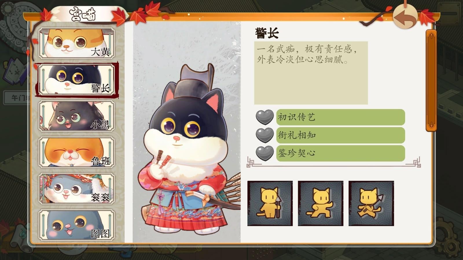 遊戲中的宮喵全部來源於生活在故宮中的貓貓們,威嚴的“鰲拜”、機靈的“警長”和憨厚的“饅頭”,跟它們學習御膳、中醫、戲曲、釣魚等多達15種掛機技能,輕鬆掛機獲得資源和製作圖紙。用它們製作各種裝扮和家具,為你的小貓咪換上新衣。